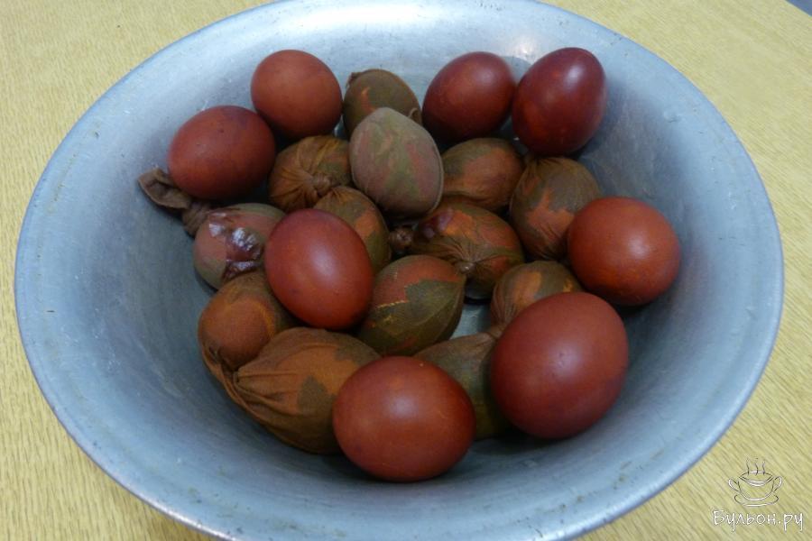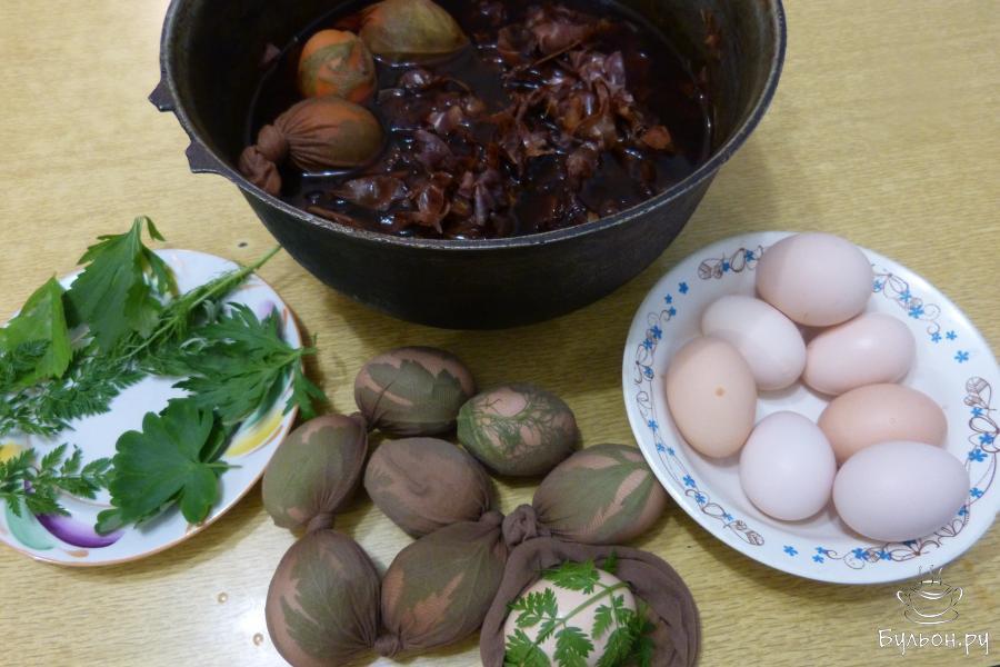 4. "Запаковать" все яйца, которые приготовили для окрашивания, опустить их в луковый охлажденный отвар так, чтобы яйца оказались под шелухой. Поставить казан на средний огонь, довести до кипения и варить 20 минут.