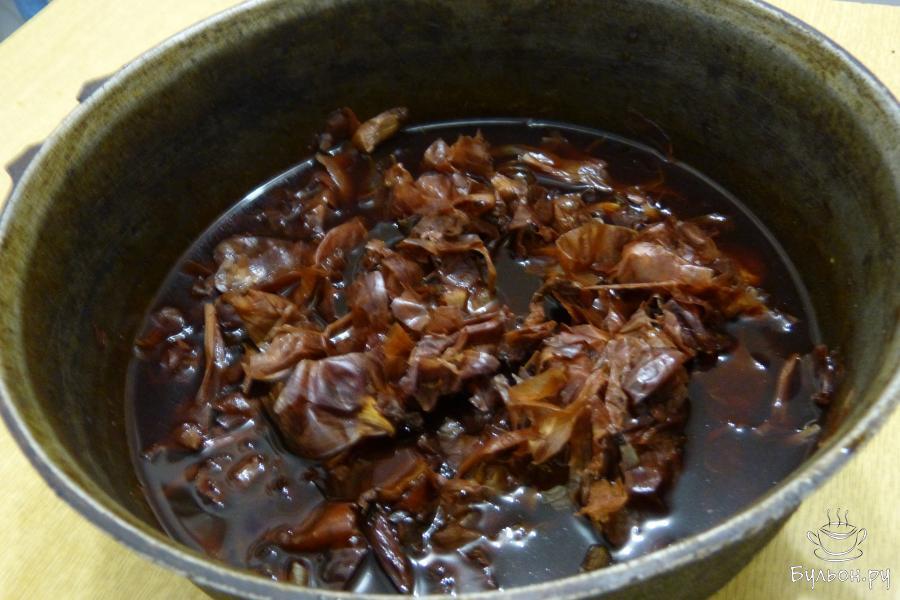 1. Луковую шелуху надо ополоснуть водой, выложить ее в казан или в кастрюлю, в которой будем варить яйца. Залить холодной водой и поставить на огонь. Кипятить 30 минут с момента закипания, остудить. Пока подготавливаем яйца для варки, наш луковый отвар хорошо настоится.
