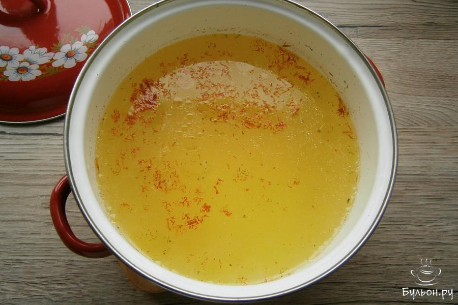11. Когда курица сварится, вынуть ее вместе с морковью, оставить для другого блюда. В бульон добавить щепотку шафрана, дать бульону покипеть 5 минут.