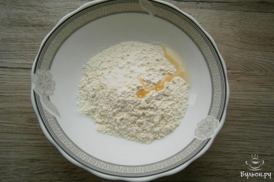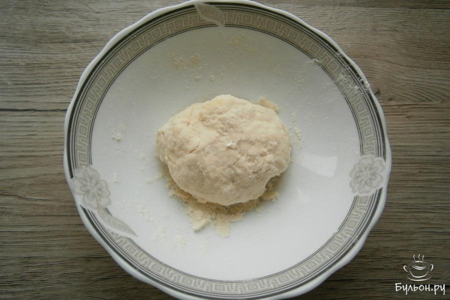 5. Влить 30 мл воды, замесить довольно тугое тесто. Дать тесту отдохнуть, накрыв его пленкой, 15-20 мин.