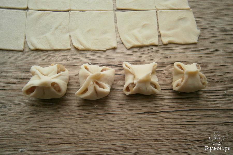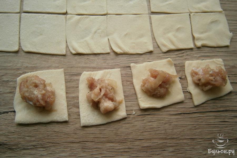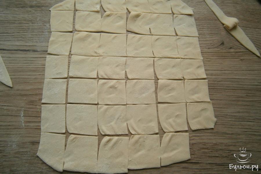 7. Тесто разделить на три части, каждую часть раскатать в тонкий пласт. Порезать тесто квадратиками, размером около 2х2 см.