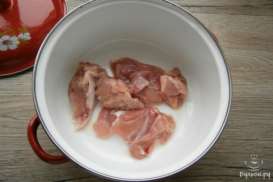 3. Поставить кастрюлю на огонь и когда вода закипит, снять аккуратно пену, бульон посолить и добавить в него порезанную половину луковицы и порезанную кусочками морковь. Варить курицу около 1-1,5 часов на медленном огне. Время варки дано для домашней курицы.