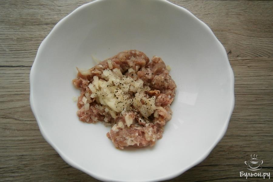 6. Смешать свиной и говяжий фарш, добавить мелко нарезанную оставшуюся половину луковицы. Фарш посолить, добавить перец, хорошенько перемешать.