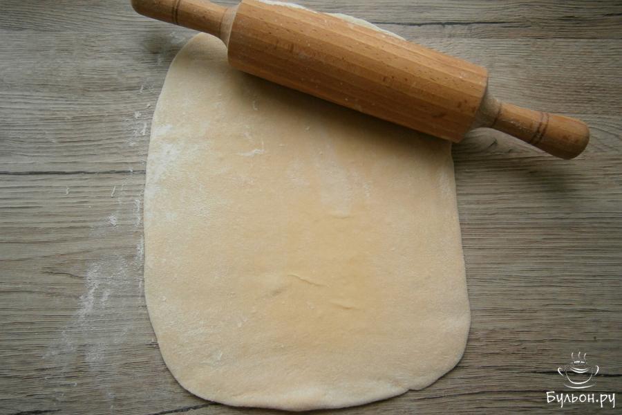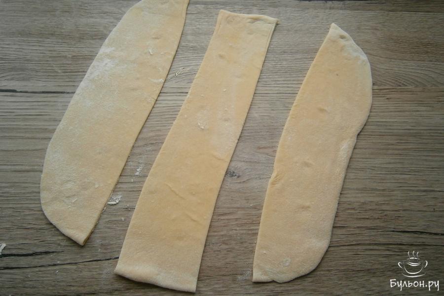 5. Тесто разделить на несколько частей, каждую - раскатать в очень тонкий пласт, длиной около 25-28 см и шириной - 20 см.