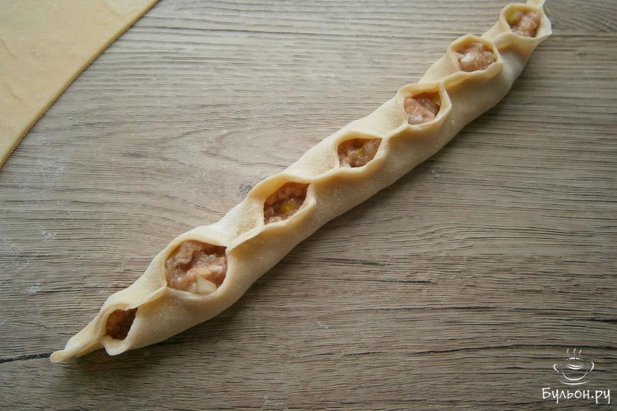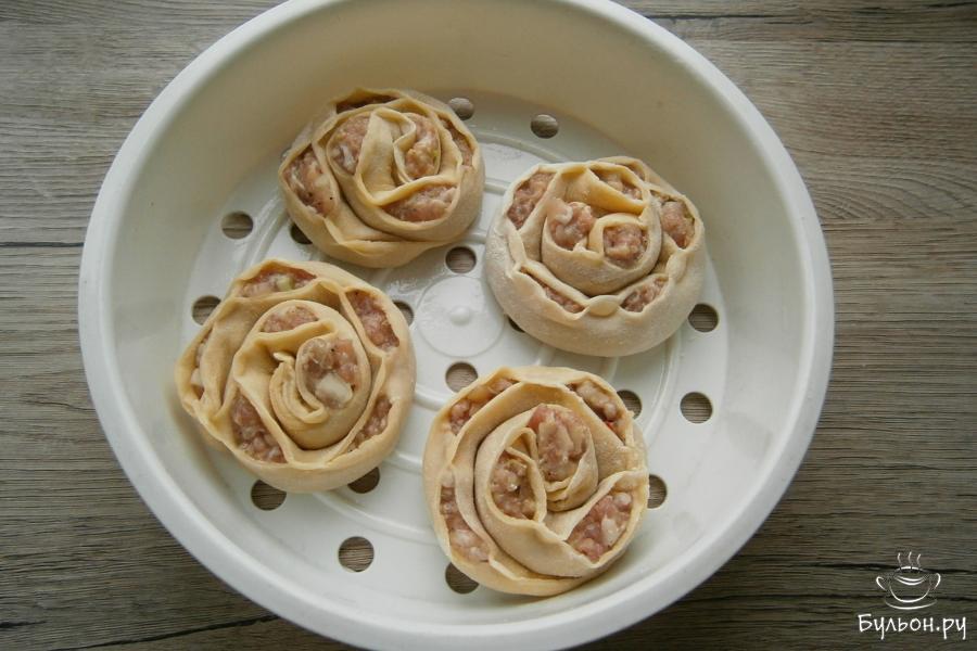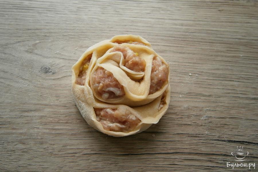 9. Затем, свернуть полосочку спиралью, конец теста подогнуть под низ и защипнуть его. Также, поступить и с остальным тестом и фаршем. Манты получатся похожими на розочки.