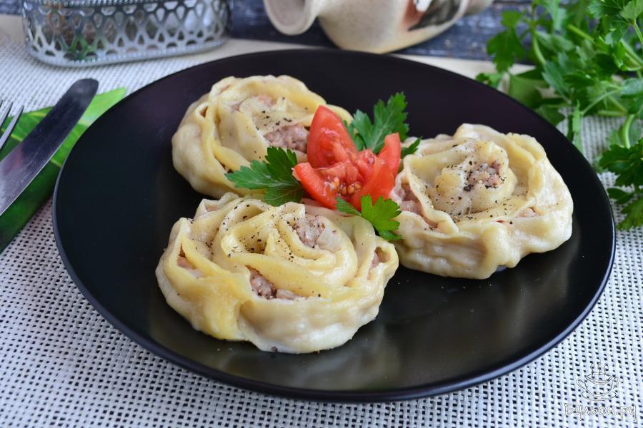 11. Готовые манты в виде красивых розочек переложить на тарелку, посыпать черным перцем и подать горячими. Приятного аппетита.